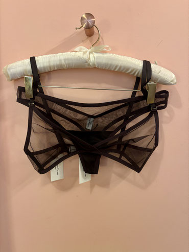Auf dem anderen Bild seht ihr ebenfalls einen Soft-BH (ja, ich habe auch Bügel-BHs im Sortiment, wirklich!) von Sarda. Er ist ein wenig zurückhaltender als der Ketten-BH, dafür mit einem Lackleder-Detail im Stoff gearbeitet.